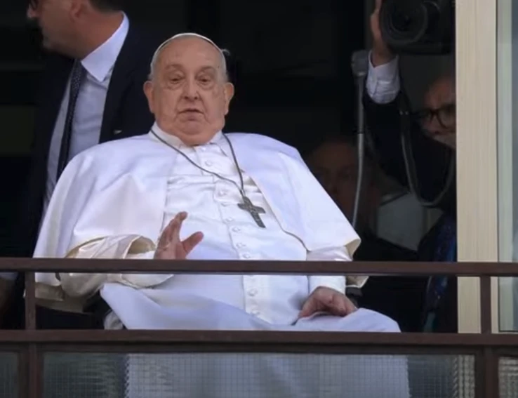Pope Francis waves from a balcony at Gemelli Hospital in Rome on Sunday, March 23, 2025, following weeks of hospitalization for bilateral pneumonia. / Credit: Vatican Media/Screenshot