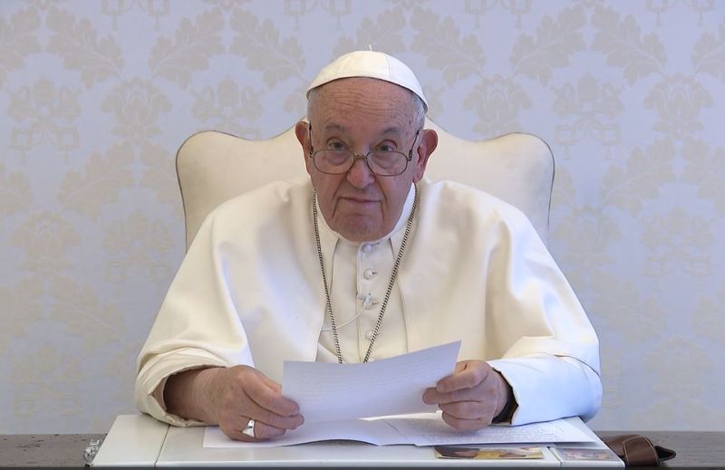 Pope Francis delivers a video message to participants in the 53rd International Eucharistic Congress, taking place in Quito, Ecuador, Sept. 8-15, 2024. The Eucharist teaches us how to have, the pope said in his message recorded at the Vatican, “a profound brotherhood, born of union with God…” / Credit: screenshot of video from Holy See Press Office