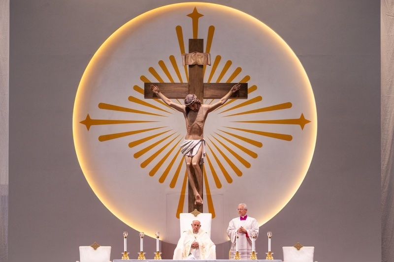 Pope Francis presides beneath a crucifix at Mass at Singapore National Stadium, Thursday, Sept. 12, 2024 / Credit: Daniel Ibáñez/CNA