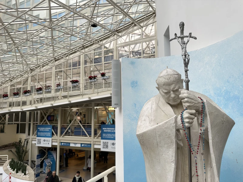 The chapel at Gemelli Hosptial in Rome bears the name and contains a relic of another pope who knew these corridors well: St. John Paul II. The Polish pontiff was hospitalized here multiple times, including after an assassination attempt in 1981. / Credit: Courtney Mares/CNA