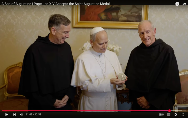 Pope Leo XIV accepts the Medal of St. Augustine from Fr. Robert P. Hagan, O.S.A., prior provincial of the Augustinian Province of St. Thomas of Villanova (R) and Fr. Joseph Farrell, O.S.A., vicar general of the Order of St. Augustine (L) in a video released on Aug. 28, 2025. / Credit: Screenshot from the YouTube page of the Augustinian Province of St. Thomas of Villanova