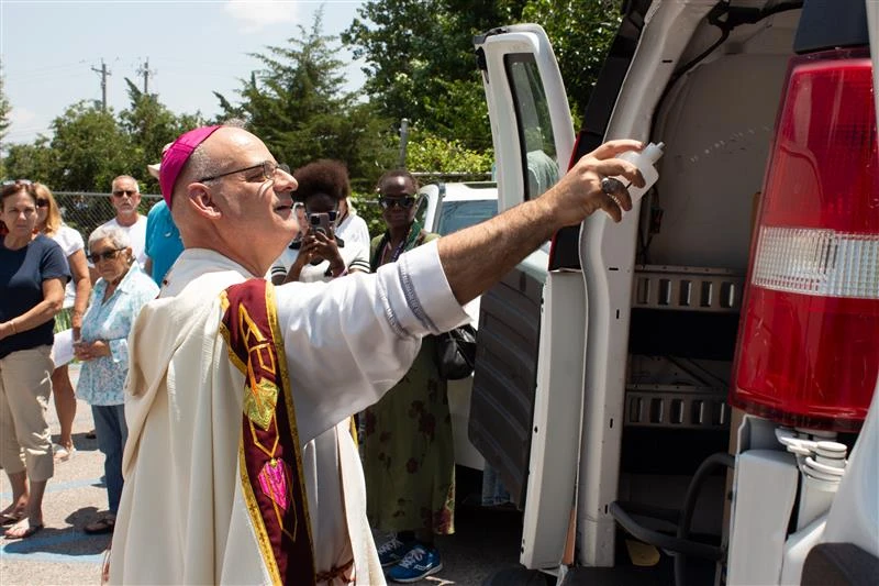 Auxiliary Bishop Mark Rivituso of St. Louis blesses donations in a van used during the National Eucharistic Pilgrimage in July 2024. On July 1, 2025, Pope Leo XIV appointed Rivituso archbishop of Mobile, Alabama. / Credit: Jonah McKeown/CNA