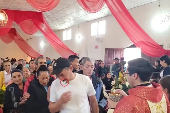 The sequence, which can be seen beginning at 1:06:11 on the Facebook page of Channel 16 in Ocotepeque, shows how the man makes an unusual gesture, moving his mouth forward to take the Host from the priest’s hand, instead of waiting for the priest to place it on his tongue.