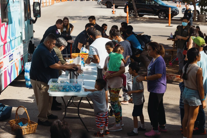 Groups of migrants wait outside the Migrant Resource Center to receive food from the San Antonio Catholic Charities on Sept. 19, 2022, in San Antonio, Texas. / Credit: Jordan Vonderhaar/Getty Images