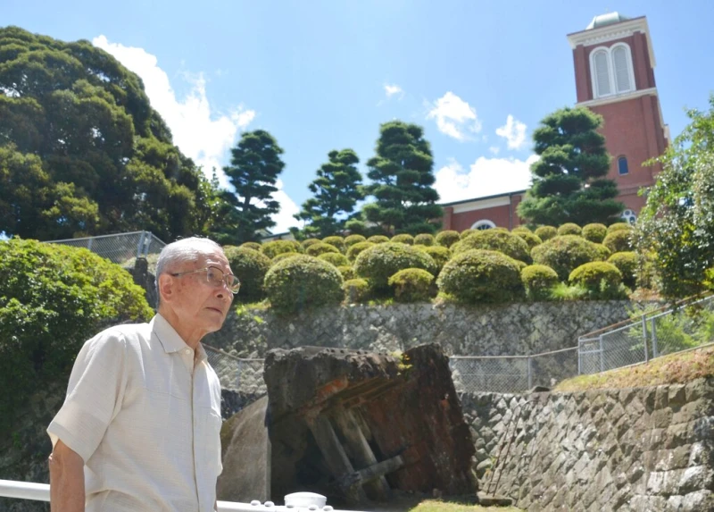 Catholic Shigemi Fukahori stands in front of the former bell tower of the Urakami Cathedral in Nagasaki, Nagasaki Prefecture, on July 17, 2013. / Credit: Kyodo via AP Images