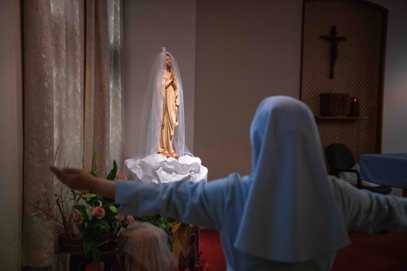 A Japanese nun holds her arms out as she prays at a chapel in her convent in Nagasaki, Japan. / Credit: Carl Court/Getty Images
