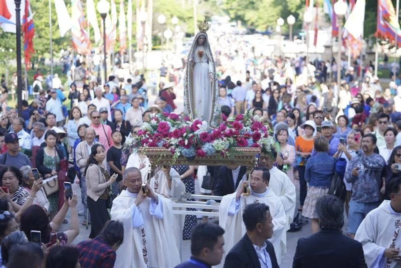 On Saturday, pilgrims participate in a large procession with a statue of Our Lady of Fátima. The pilgrims process around the city as they pray the rosary, and many wear traditional Vietnamese attire while holding signs that indicate where they traveled from.