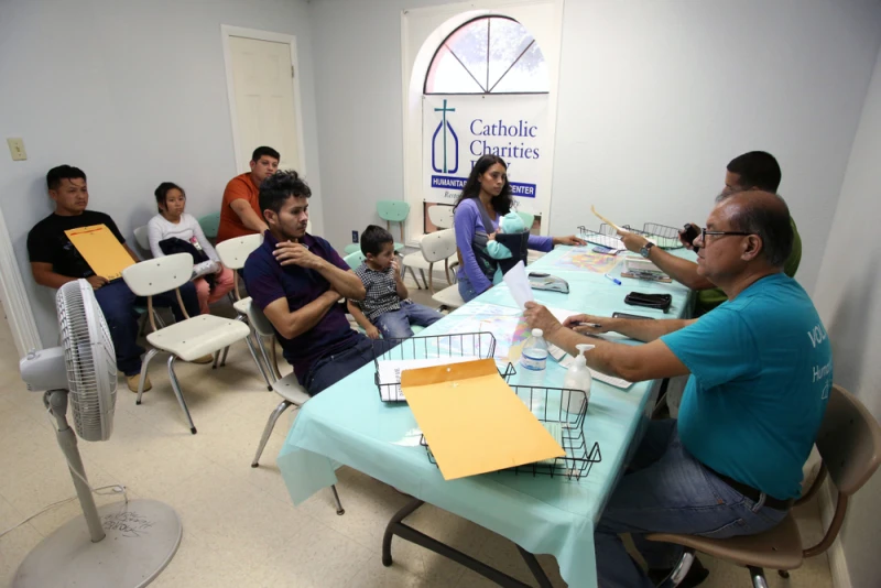 Volunteers at a Catholic Charities Humanitarian Respite Center help Central American refugees prepare to take a bus to go stay with U.S. family on Aug. 17, 2017, in McAllen, Texas. / Credit: Vic Hinterlang/Shutterstock