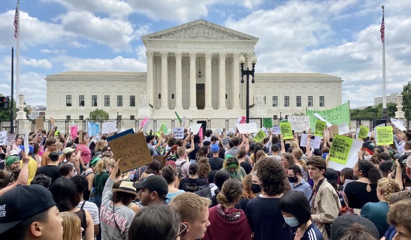 The scene outside the U.S. Supreme Court in Washington, D.C., after the court released its decision in the Dobbs abortion case on June 24, 2022. Pro-abortion demonstrators gradually made up a decided majority of the crowd as the day wore on. / Credit: Katie Yoder/CNA