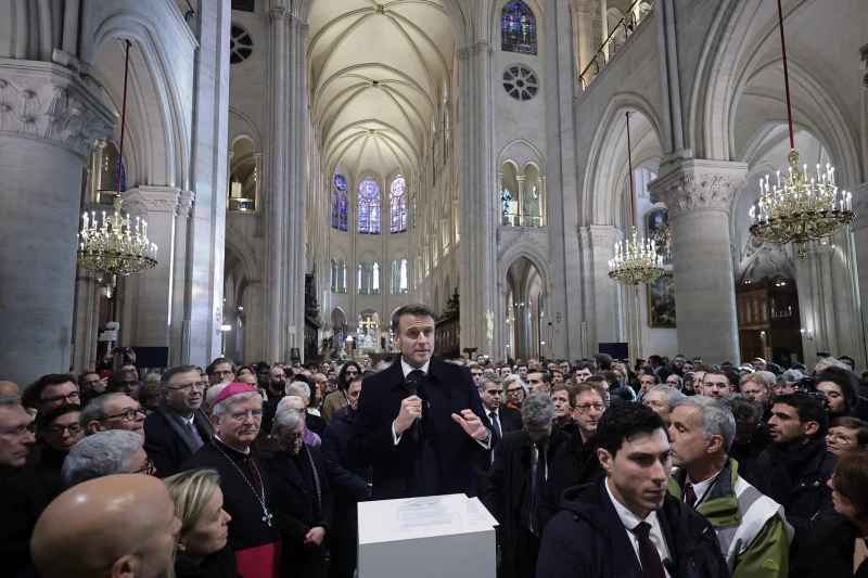 Attendees including workers of reconstruction of Notre-Dame de Paris Cathedral gather during a speech by French President Emmanuel Macron (center) in the nave of the cathedral in Paris on Nov. 29, 2024. / Credit: CHRISTOPHE PETIT TESSON/POOL/AFP via Getty Images