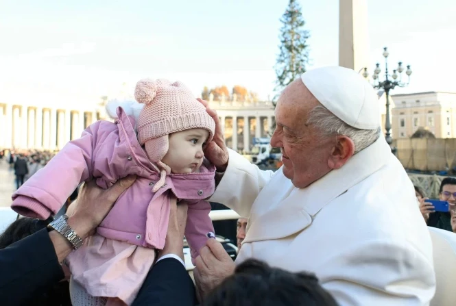 Pope Francis blessing a baby during a general audience. / Credit: Vatican Media