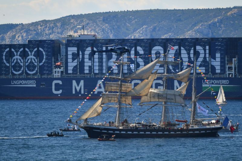 The French 19th-century three-masted barque Belem is seen from the Palais du Pharo in the southern port city of Marseille on May 8, 2024, before the Olympic Flame arrival ceremony, ahead of the Paris 2024 Olympic and Paralympic Games. The Belem is set to reach Marseille on May 8 and ten thousand torchbearers will then carry the flame across 64 French territories. / Credit: SYLVAIN THOMAS/AFP via Getty Images