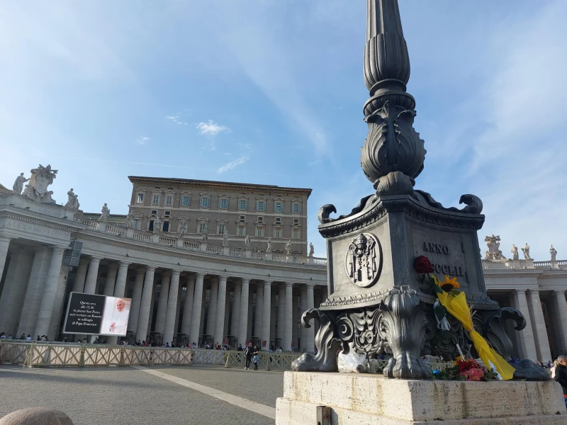 Bouquets of flowers are left by visitors to St. Peter’s Square on Easter Monday following the news of the death of Pope Francis, Monday, April 21, 2025. / Credit: Kristina Millare/CNA