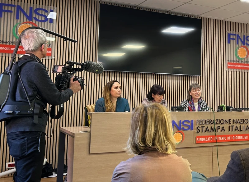 Lawyer Laura Sgro, left, sits with Gloria Branciani, center, and Marjiam Kovač during a press conference in Rome on Feb. 21, 2024. Branciani and Kovač allege that they were subjected to spiritual, psychological, and sexual abuse by famous mosaic artist Father Marko Rupnik. / Credit: Matthew Santucci/CNA