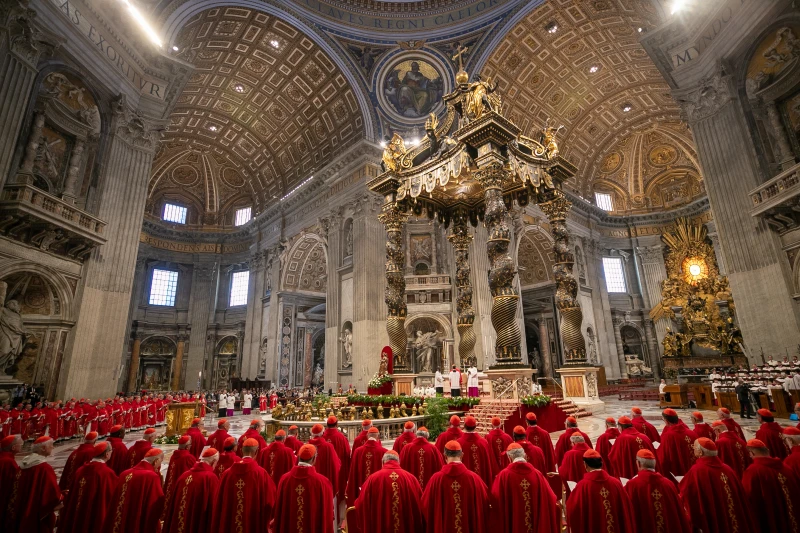 Cardinals participate in the fifth Novendiales Mass for Pope Francis on April 30, 2025, in St. Peter’s Basilica at the Vatican. / Credit: Daniel Ibañez/CNA