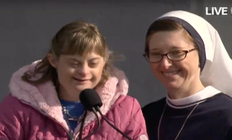 Sister Mary Casey O’Connor, SV, and her twin sister, Casey Gunning, who has Down syndrome, speak at the March for Life Rally in 2023. / Credit: Screenshot EWTN YouTube